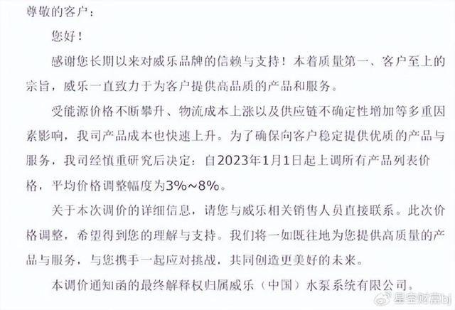 2022年底,因為原材料漲價、物流成本增加、能源價格上漲等多重因素,水泵玩家的供應鏈出現(xiàn)了緊張的局面。也正是那個時候,不少玩家都通過漲價來傳導成本的壓力。筆者統(tǒng)計了一下,玩家的漲幅從3%到20%不等。